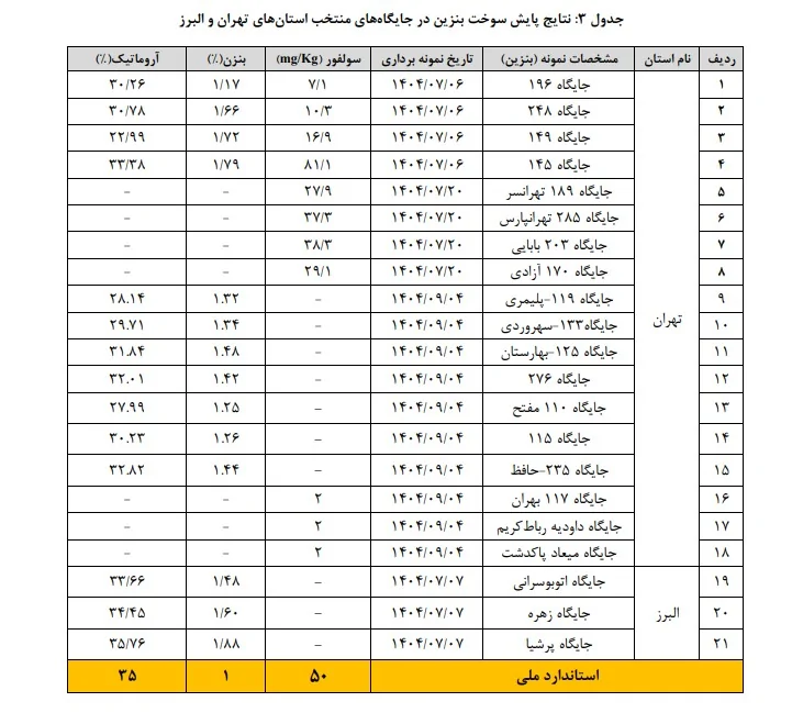 بخش پایش بنزین این گزارش نشان میدهد از منظر گوگرد، وضعیت بنزین توزیعی در جایگاههای منتخب تهران و البرز عموما با استاندارد یورو۴ سازگار است و مقادیر سولفور در نمونههای تحلیلشده زیر حد مجاز ۵۰ ppm قرار دارد. اما متغیر کلیدی مشکلساز، بنزن است؛ نتایج جدول پایش حاکی از آن است که در همه نمونههای دارای اندازهگیری بنزن، مقدار ثبتشده بالاتر از سقف استاندارد ملی یعنی یک درصد حجمی است و در برخی نمونهها به حدود ۱.۷ تا ۱.۸ درصد هم میرسد.